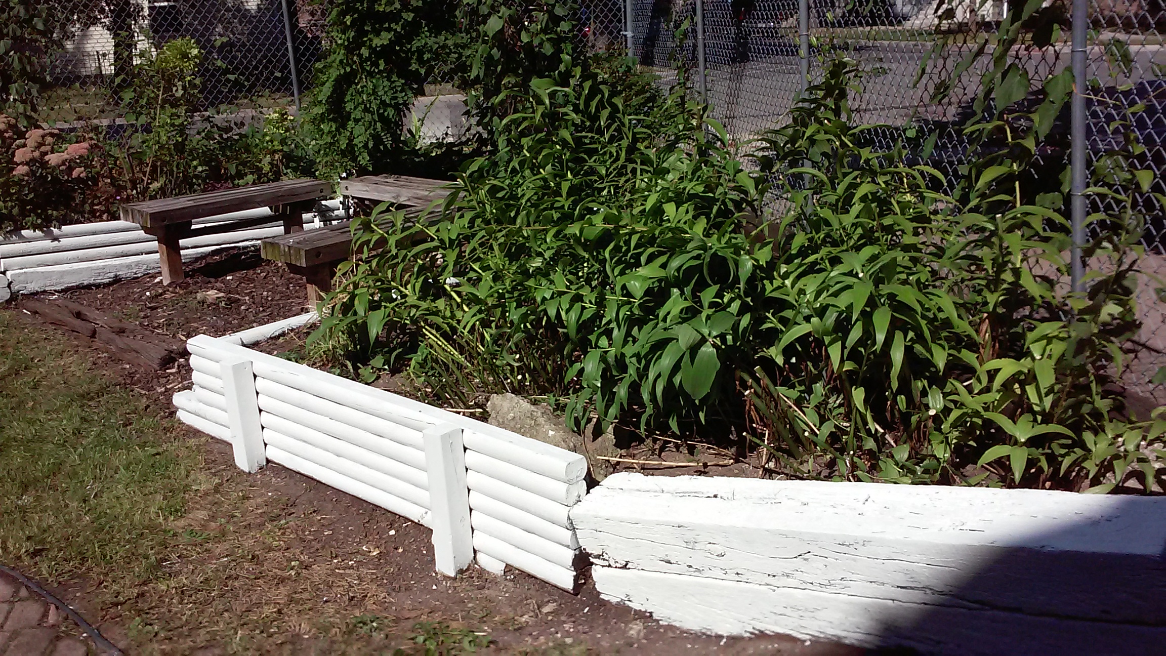 In the course of 5 1/2 hours, the students scraped and painted the entire retaining wall on the north side of Mr. Willie Mark’s 1900 S. Ridgeway Enabling Garden. Mr. Marks brought out an electronic device that can be connected to an I Pad, and Nate played his “list” while the students worked And did they work! Minimal breaks, maximum dedication. LaVerne supervised while Mamie and Ellen cleared out a weedy place in the back of the garden, and Mamie is serious with a garden lopper, she did renewal pruning on a very overgrown viburnum.