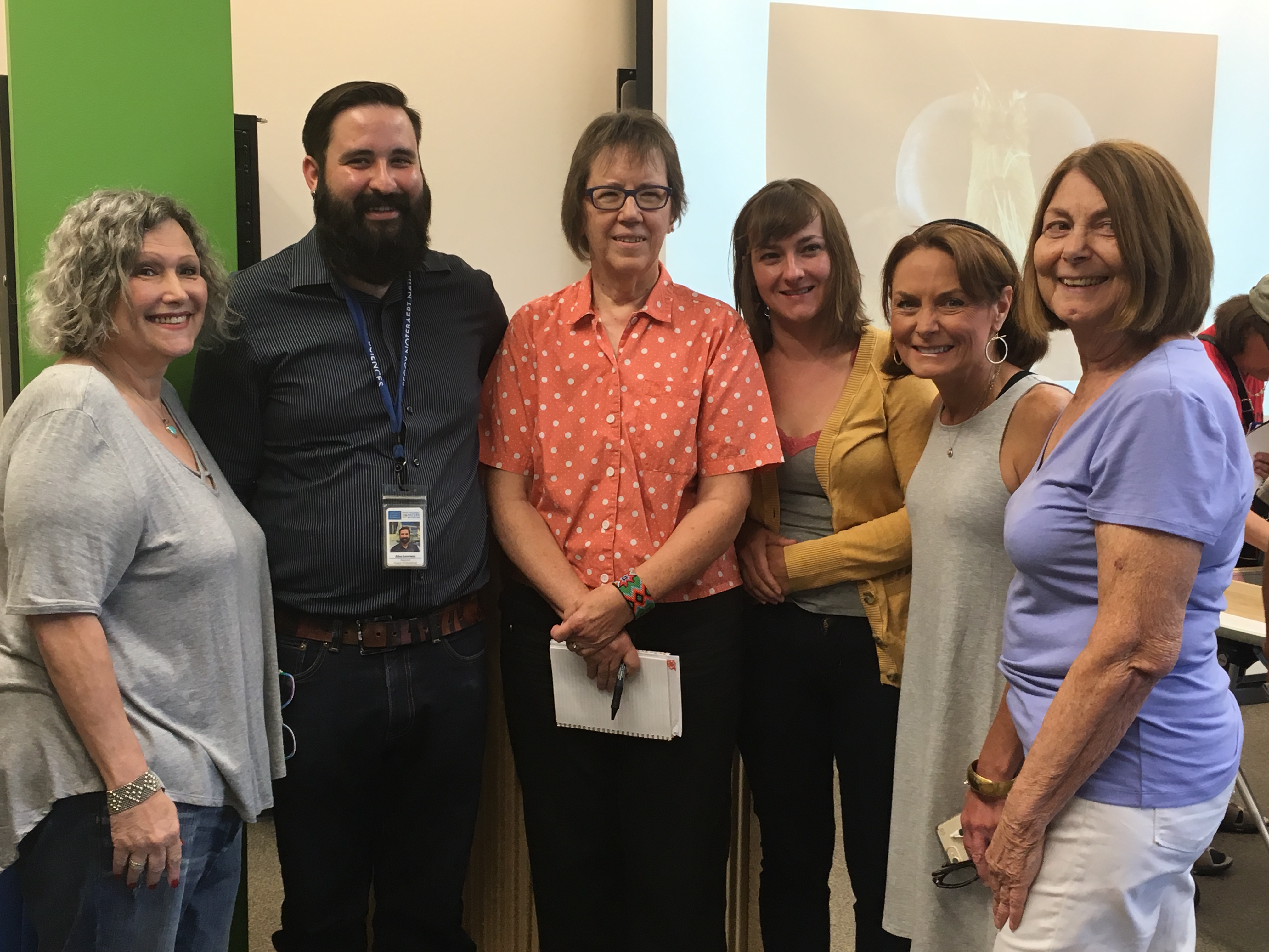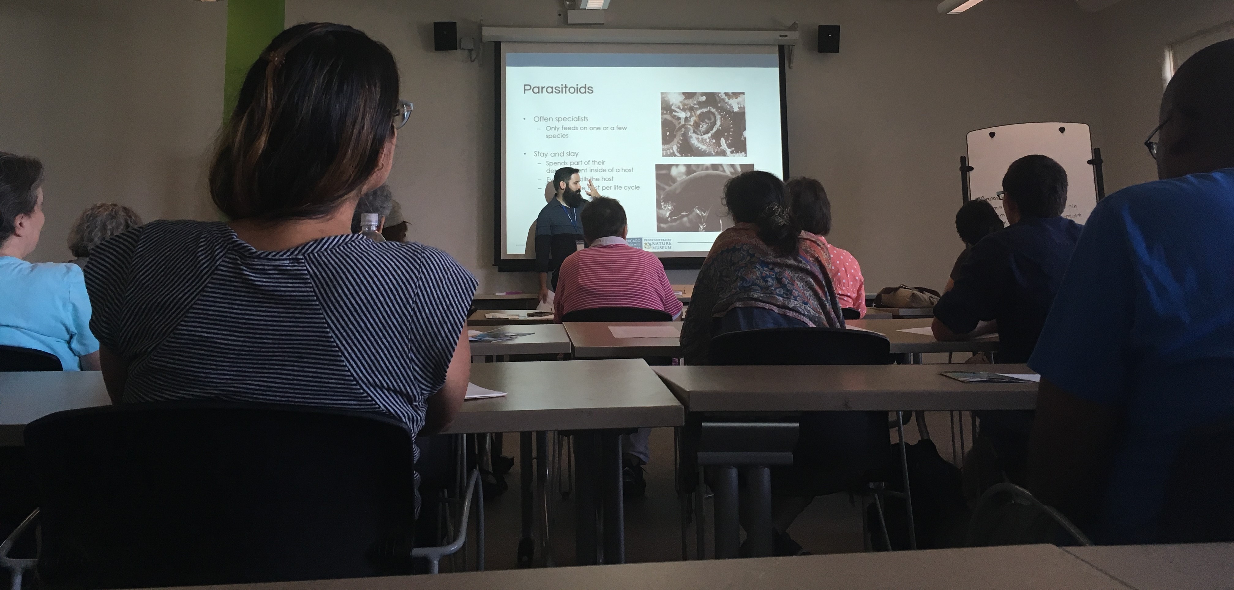 The CCGA Education team brought an important and necessary topic to gardeners and presenter Allen Lawrance from the Peggy Notebaert Nature Museum hit all the sweet spots of gardening with and for beneficial insects. Folks were clearly interested in the very focused presentation. The book table was set up with copies of informative reading, colorful guides full of photos, and some recently published material. Allen brought two glass-topped display boxes that held native butterflies as well.