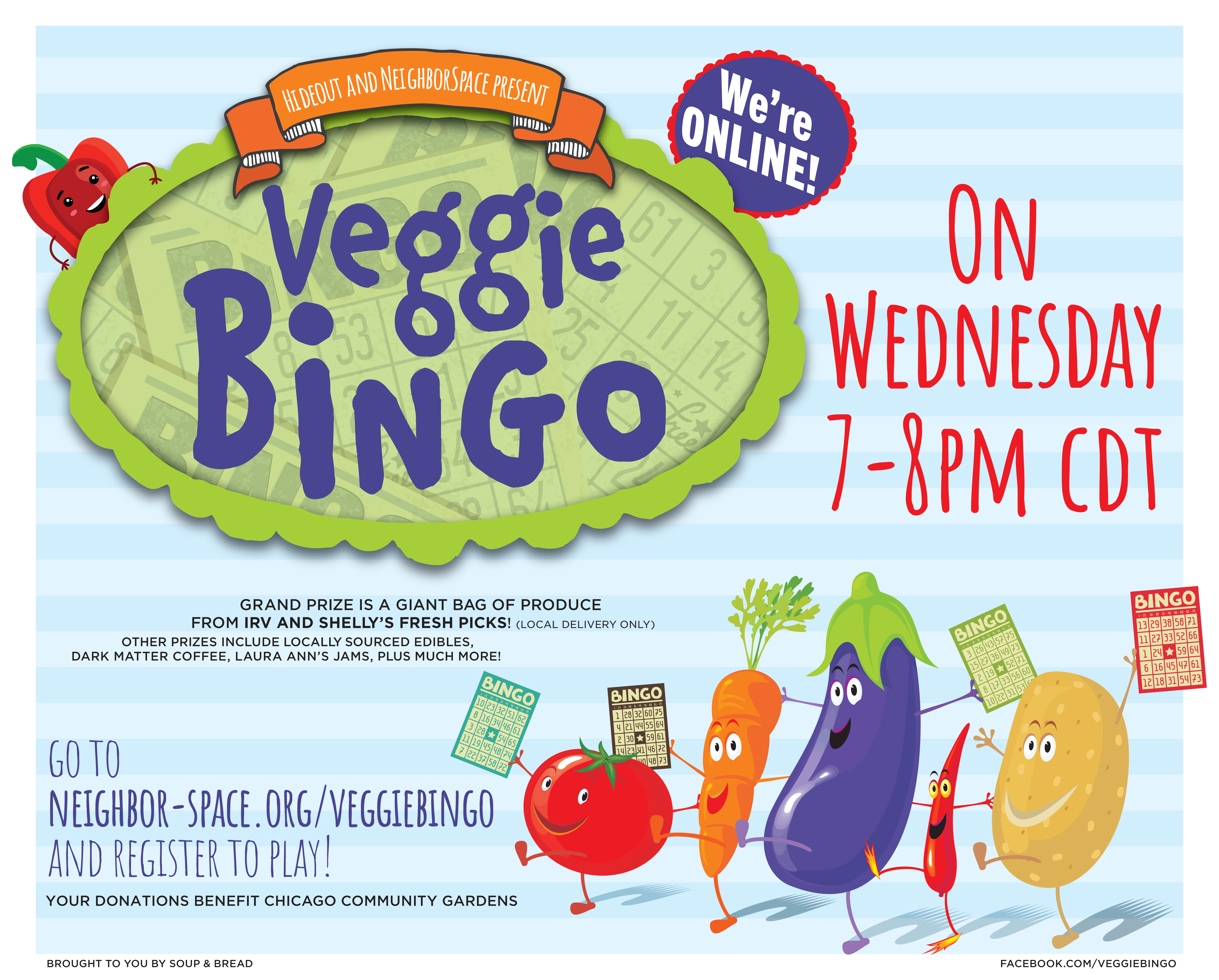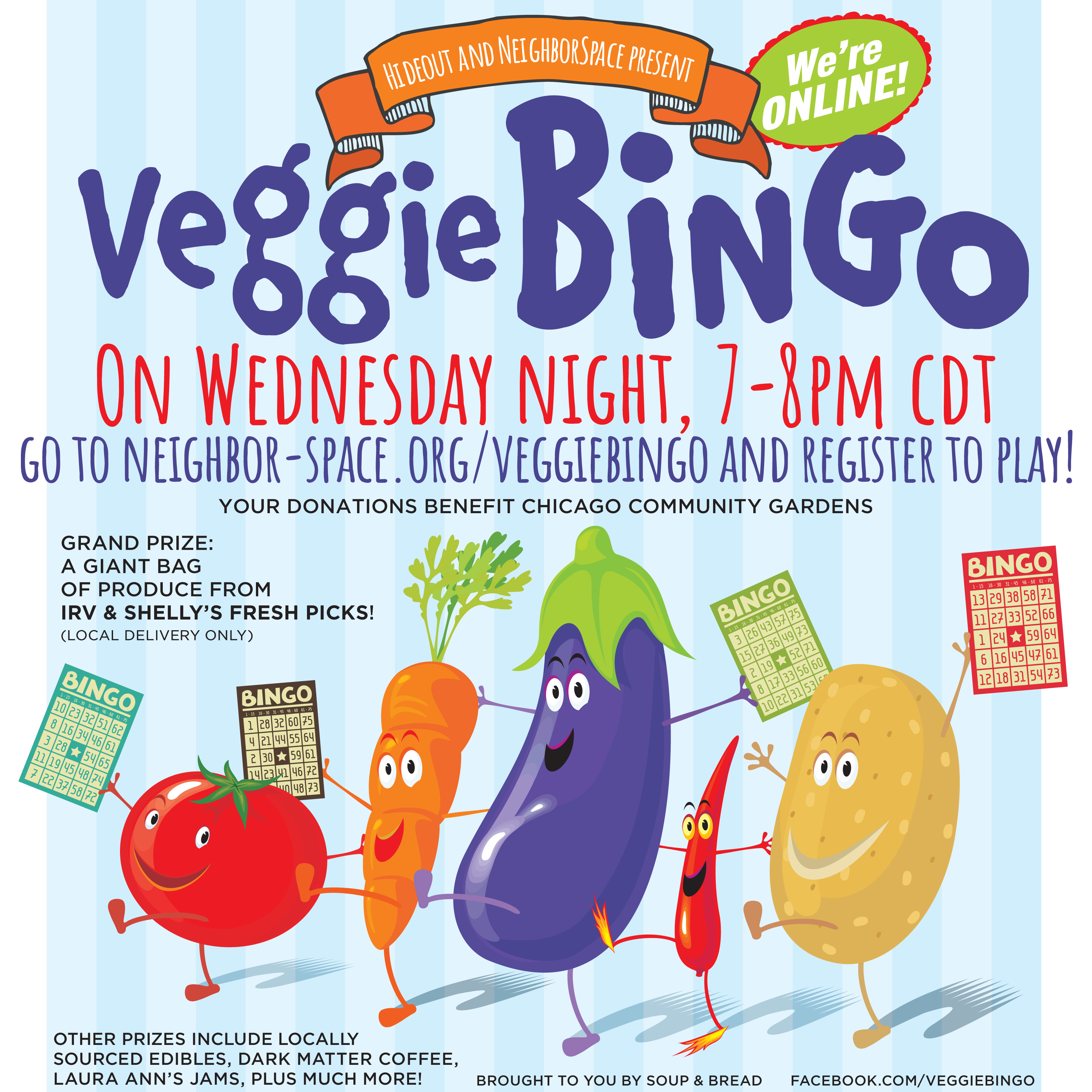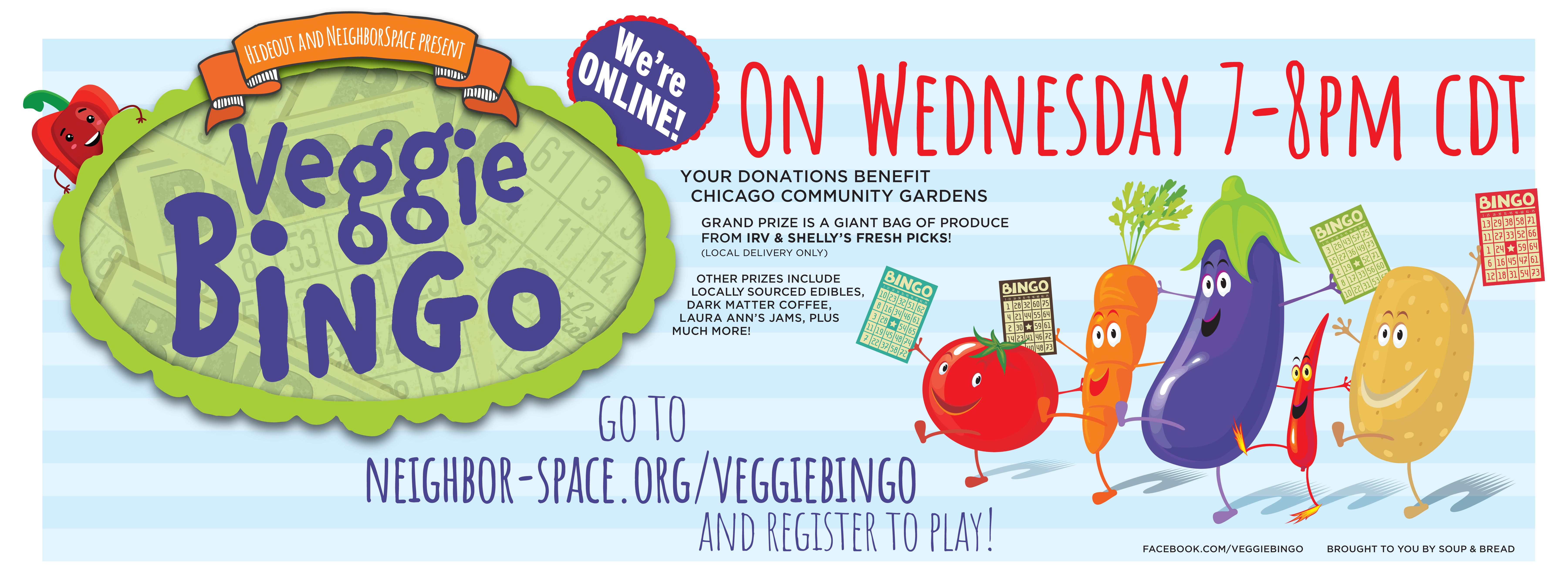 > - Like and share the Veggie Bingo facebook page <https://www.facebook.com/VeggieBingo/>, direct people to the Veggie Bingo website <http://neighbor-space.org/veggiebingo/> and the Virtual Veggie Bingo GoFundMe Page <https://charity.gofundme.com/o/en/campaign/virtual-veggie-bingo-2020>.