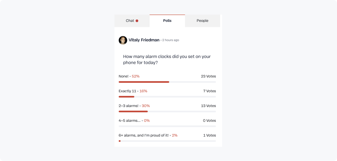 Here’s a pic of the poll tab in the Hopin chat. You can see that the poll questions will include the name of the person who posted them.