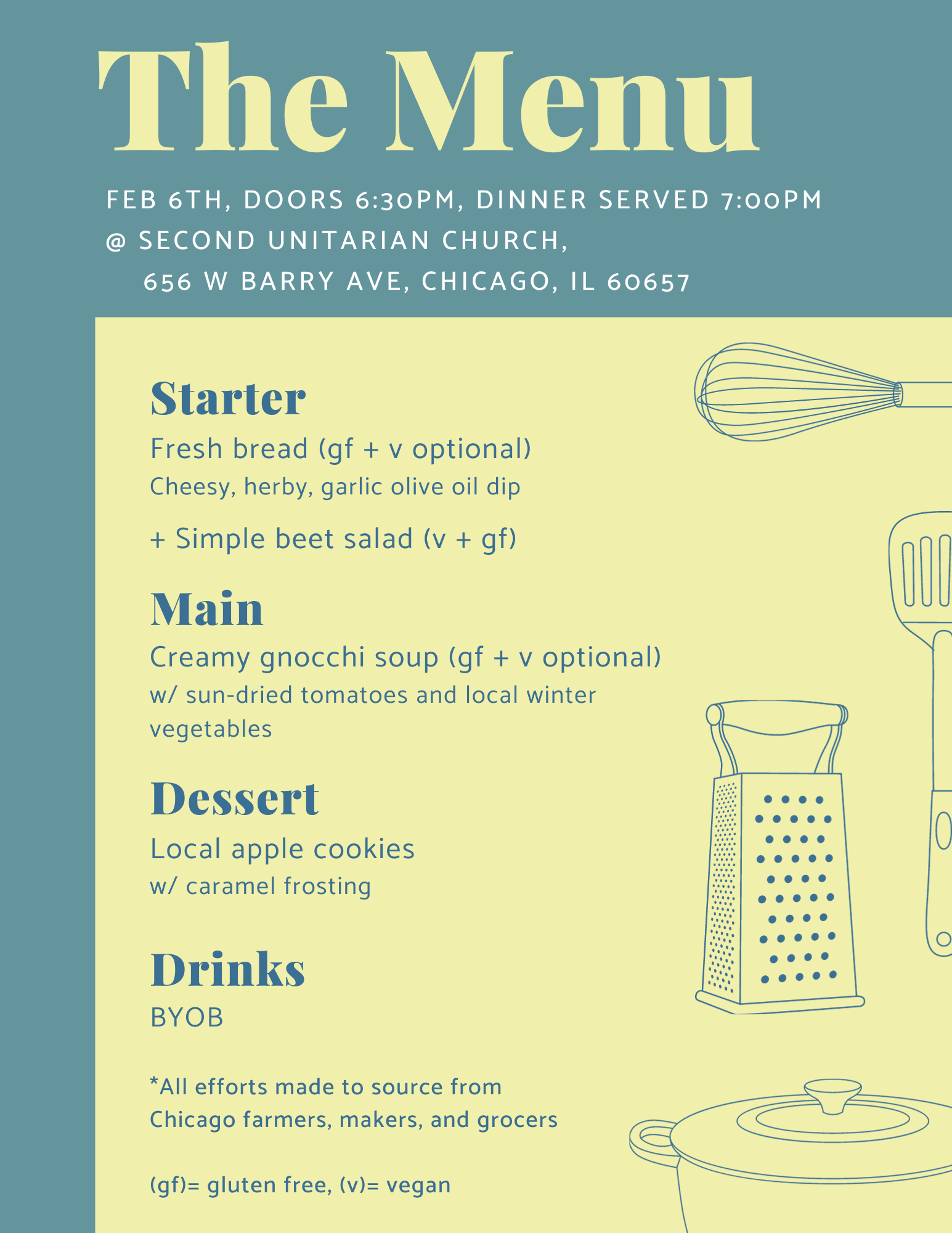· Time: Doors at 6:30pm, Dinner at 7pm