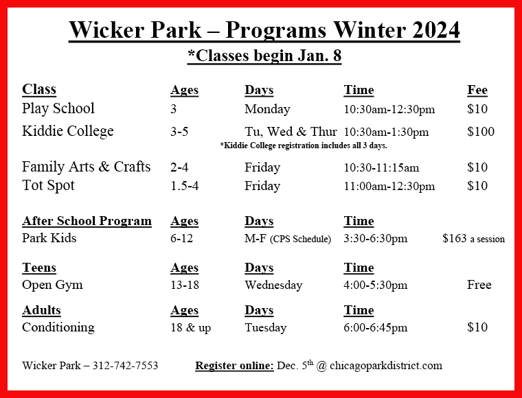 Winter Classes <https://www.chicagoparkdistrict.com/winter-programs> (Class