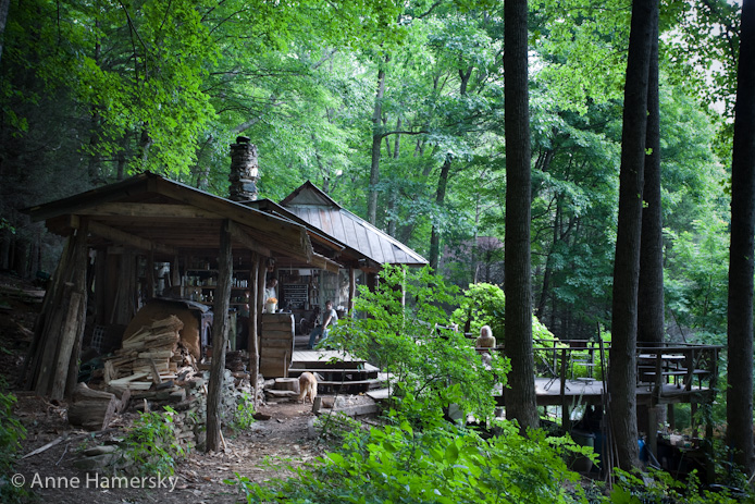 On one visit, I got to talk with a medicinal herb farmer in the mountains of North Carolina named Joe Hollis. For thirty years Joe had been striving to embody his manifesto of Paradise Gardening and that is what drew me to him – I wanted to include someone in the book that had a handmade ideology that guided their life’s work. Stepping onto Hollis’ land was like entering a fantasy novel, with hand-bent archways, winding pathways and patches of beautiful and unfamiliar plantlife. The architecture was built into the mountain slope and included yurts, A-frames and a central building functioning as a library, lab, pharmacy and outdoor kitchen. Perusing the thousands of books on his shelf, the spectrum impressed me – classics of existentialist, left-wing anarchist and socialist thought mingled with poetry, anthropology, botany, ornamental gardening and guides to all sorts of tools and technology.