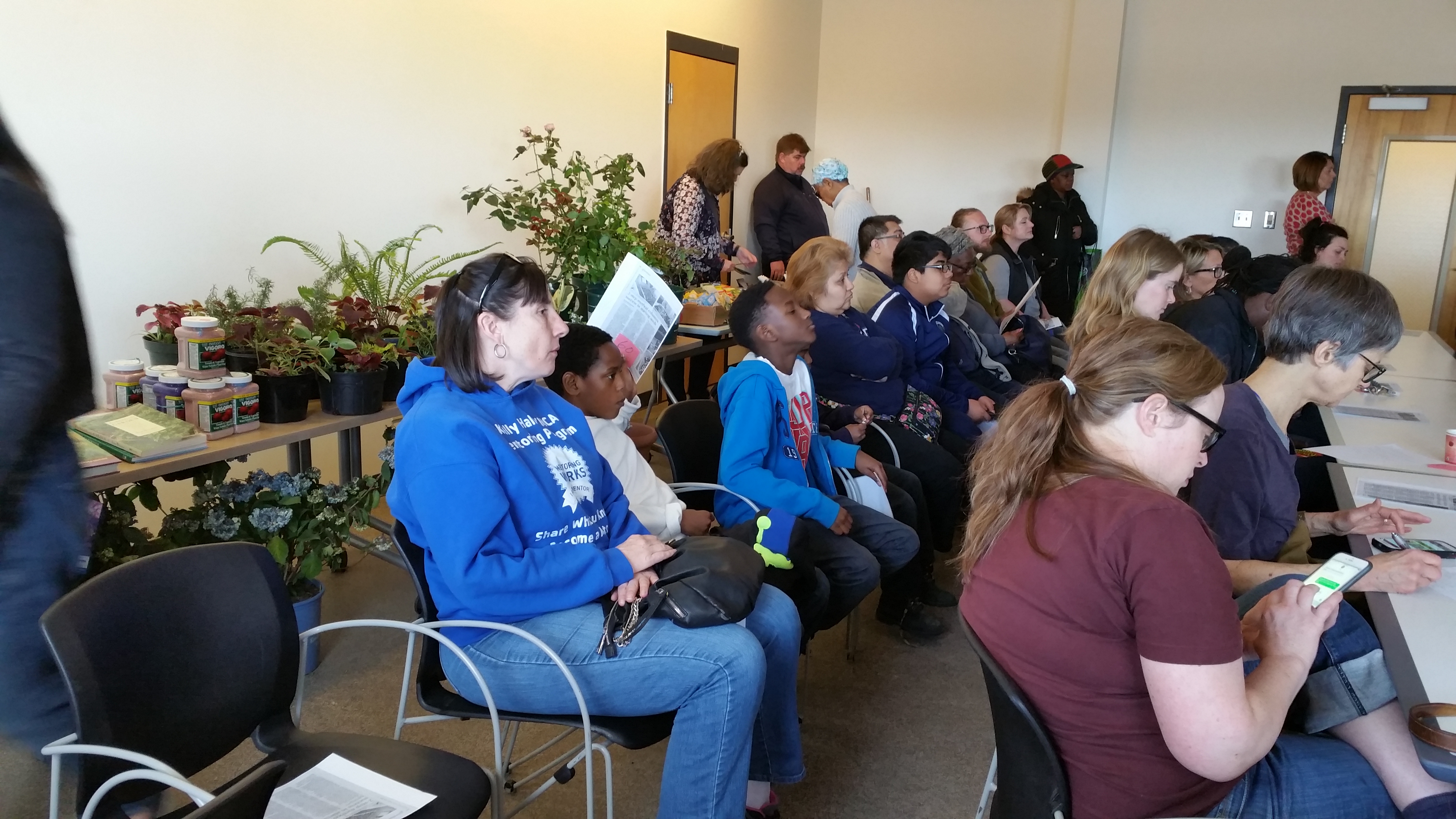 On a delightful, sunny morning, a day to open windows and let fresh air in, a welcome spring day after several days of rain, the GGCA Resources committee held its Annual Spring distribution April 8th. The morning began with a talk by Val Kehoe, Horticulture Coordinator for University of Illinois Extension – Urbana-Champaign. Val gave a talk about hardy plants for hardy soils here in Chicago. From annuals, both winter and summer, to biennials and through perennials, both creeping and simple, Val gave a thorough explanation of each with pros and cons for community gardeners. Her slide show was packed with engaging pieces of information, graphics and photos that illustrated every point she made. It was a terrific showcase to come before a distribution of flowering plants; it made everyone want to know more about these kinds of plants. The most seasoned gardener learned something new, and every gardener came away with a better understanding of what it is we do out there in our gardens and how to do it better. People really warmed up to Val and freely shared their gardening experience, others asked questions to confirm so much new knowledge, and many sought her out after the presentation. University of Illinois extension prepares excellent handouts for gardeners, and not one remained as folks left.